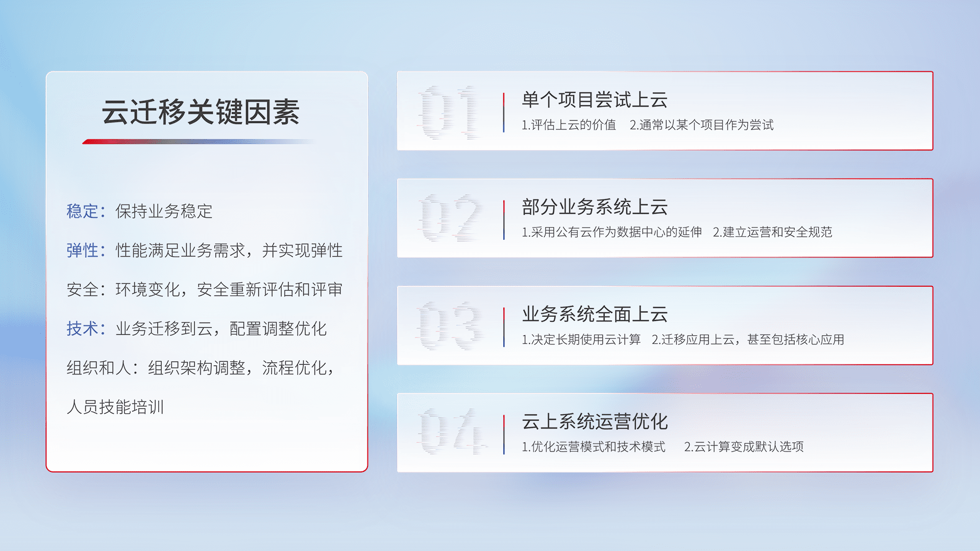 结合实际业务,,,,从规划设计、、、、云平台选型、、、云原生改造、、、、数据迁移、、、集成交付,,迁移全过程为客户识别最佳上云路径,,做好风险识别管理,,设计网络架构、、、身份权限、、、安全审计合规、、、操作审计、、、、日志审计、、、、监控告警策略、、、、多站点容灾设计等,,,对云上基础设施进行整体规划,,提升IT治理水平,,以满足弹性、、、高可用、、高性能的需求。。。