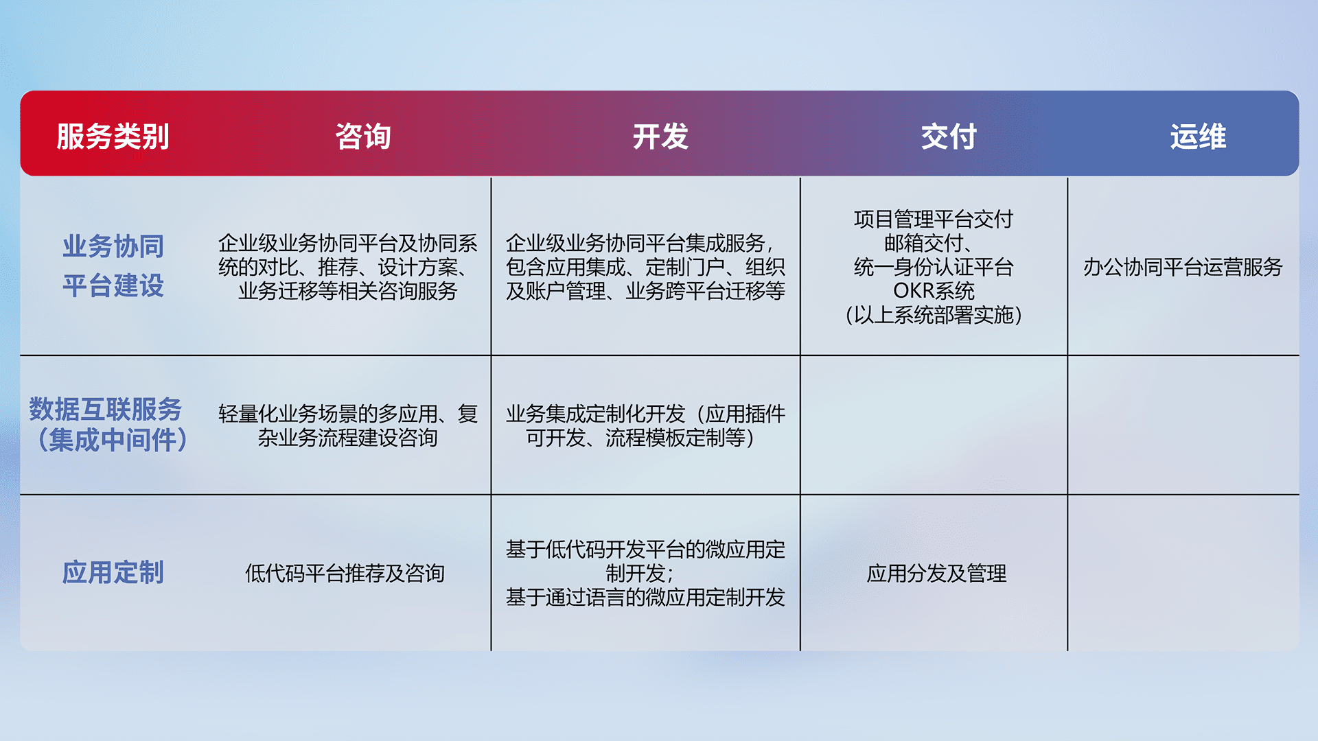 针对钉钉、、、企微、、IDaas等平台级产品提供产品的规划、、、方案、、、交付、、、定制化开发等服务,,实现如统一协同办公、、智能客户服务、、、、混合会议管理、、、智能数据查询、、、、等业务场景,,,,实现数字化转型。。。